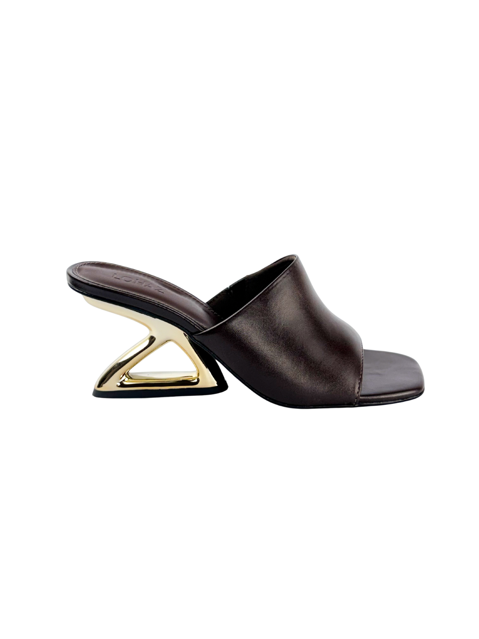 Adelle - Tamanco Feminino Salto Geométrico Ouro Gáspea Café