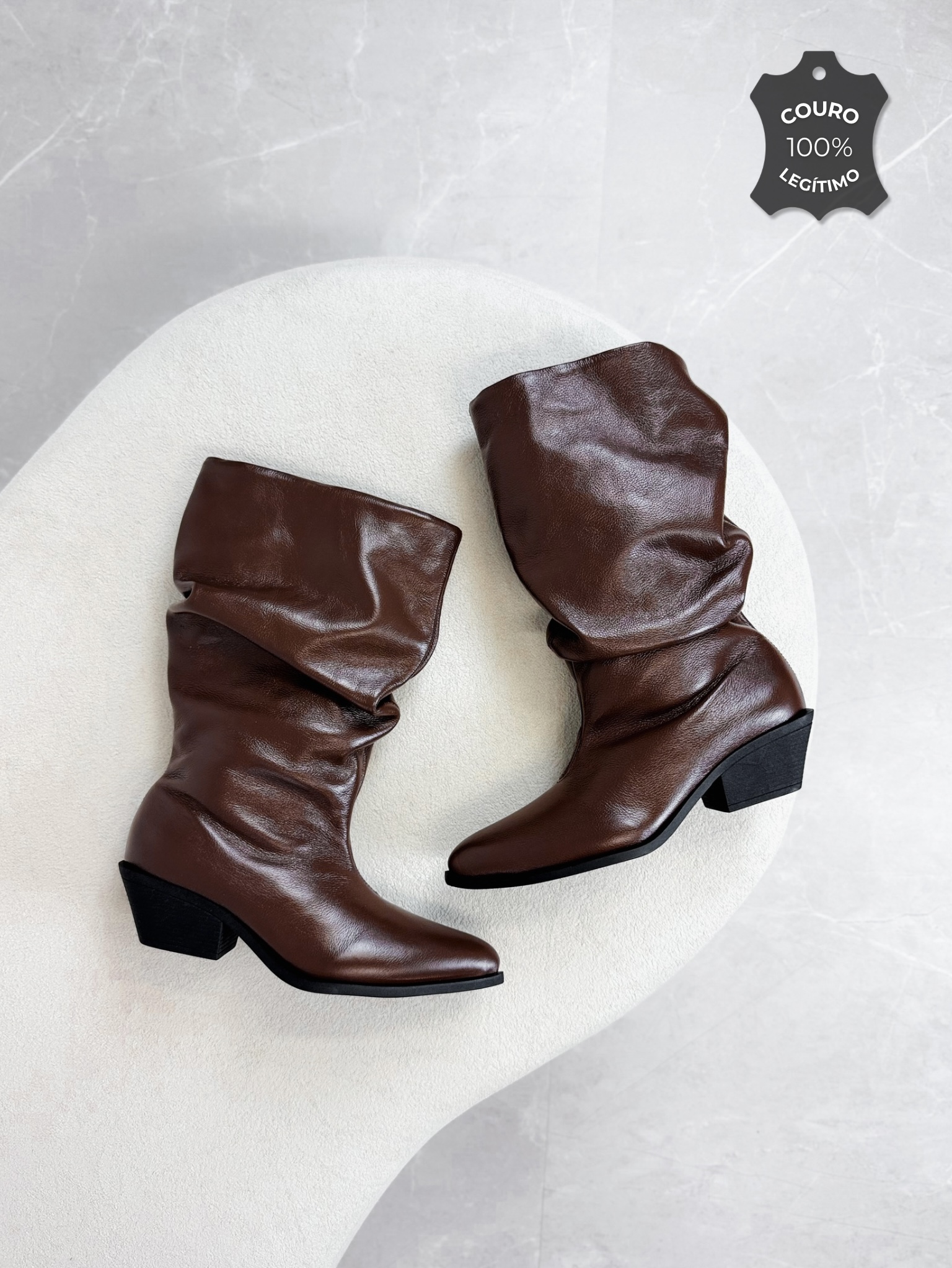 O cano médio slouch de 25 cm proporciona um visual marcante e contemporâneo, conferindo um efeito drapeado natural ao couro, que adiciona fluidez e elegância ao design. O bico fino reforça o toque refinado da peça, alongando a silhueta com sofisticação, enquanto o salto bloco de 5 cm garante conforto e estabilidade, permitindo um caminhar leve e confiante.